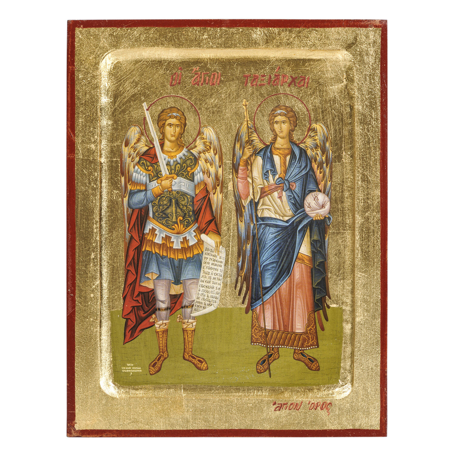 Lithography (icon) of Archangels Michael & Gabriel the Taxiarchs with real gold leaf in MDF.