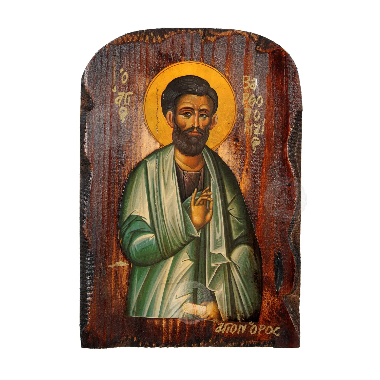 Mount Athos weathered lithography (icon) of Saint Bartholomew the Apostle in pine wood with carved decoration.