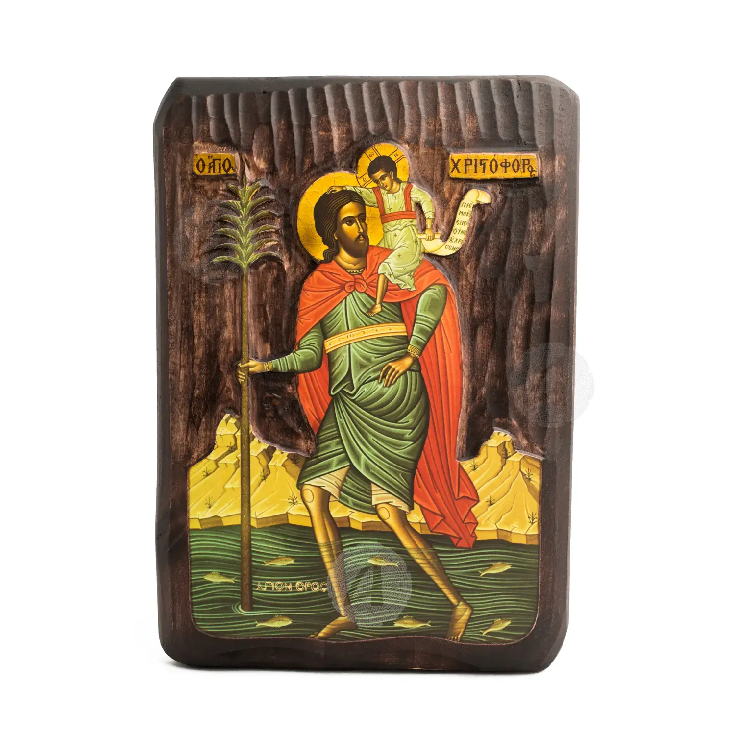 Mount Athos lithography (icon) of Saint Christopher the Martyr on natural wood carved by hand.