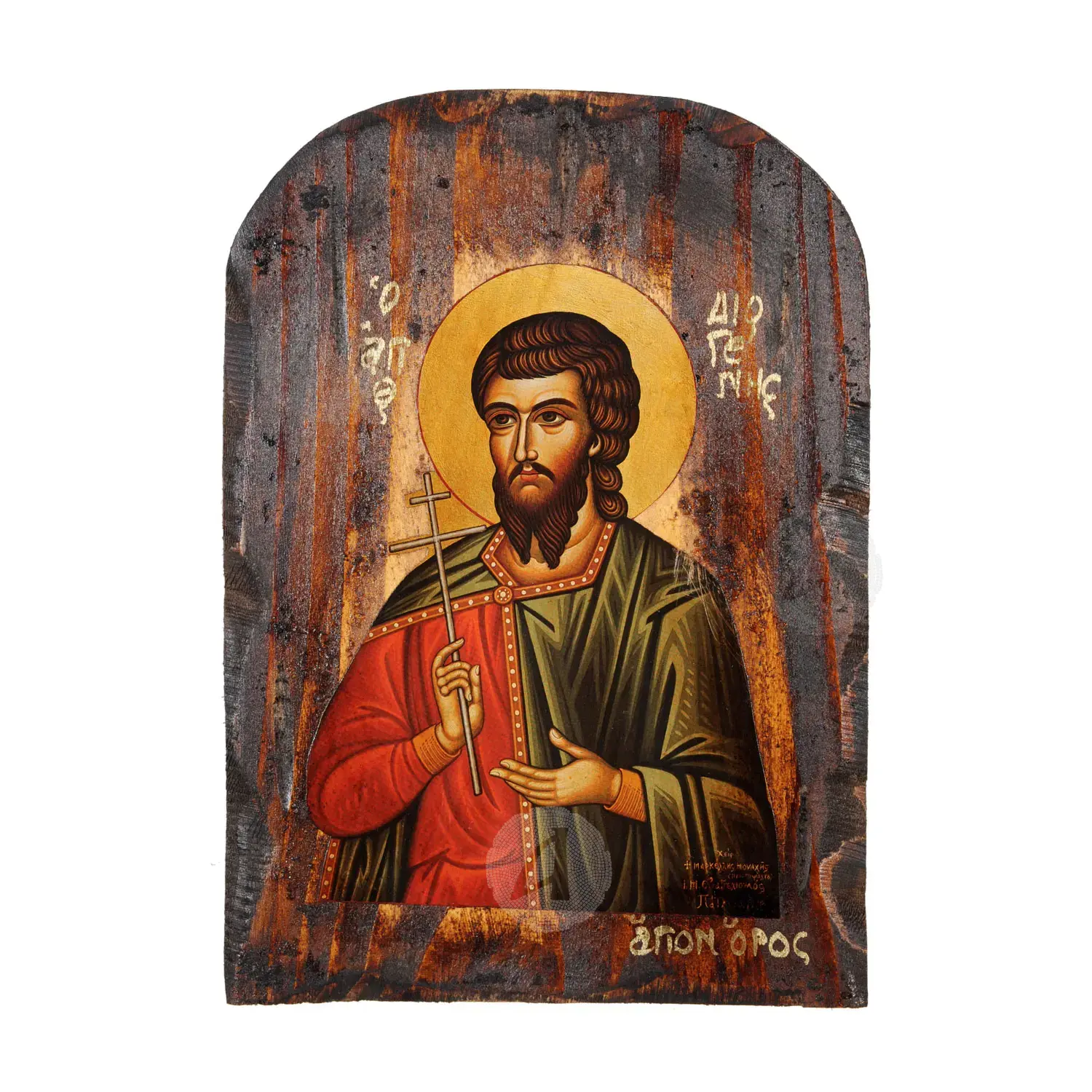 Weathered lithography (icon) of Saint Diogenes the Martyr in pine wood with carved decoration.