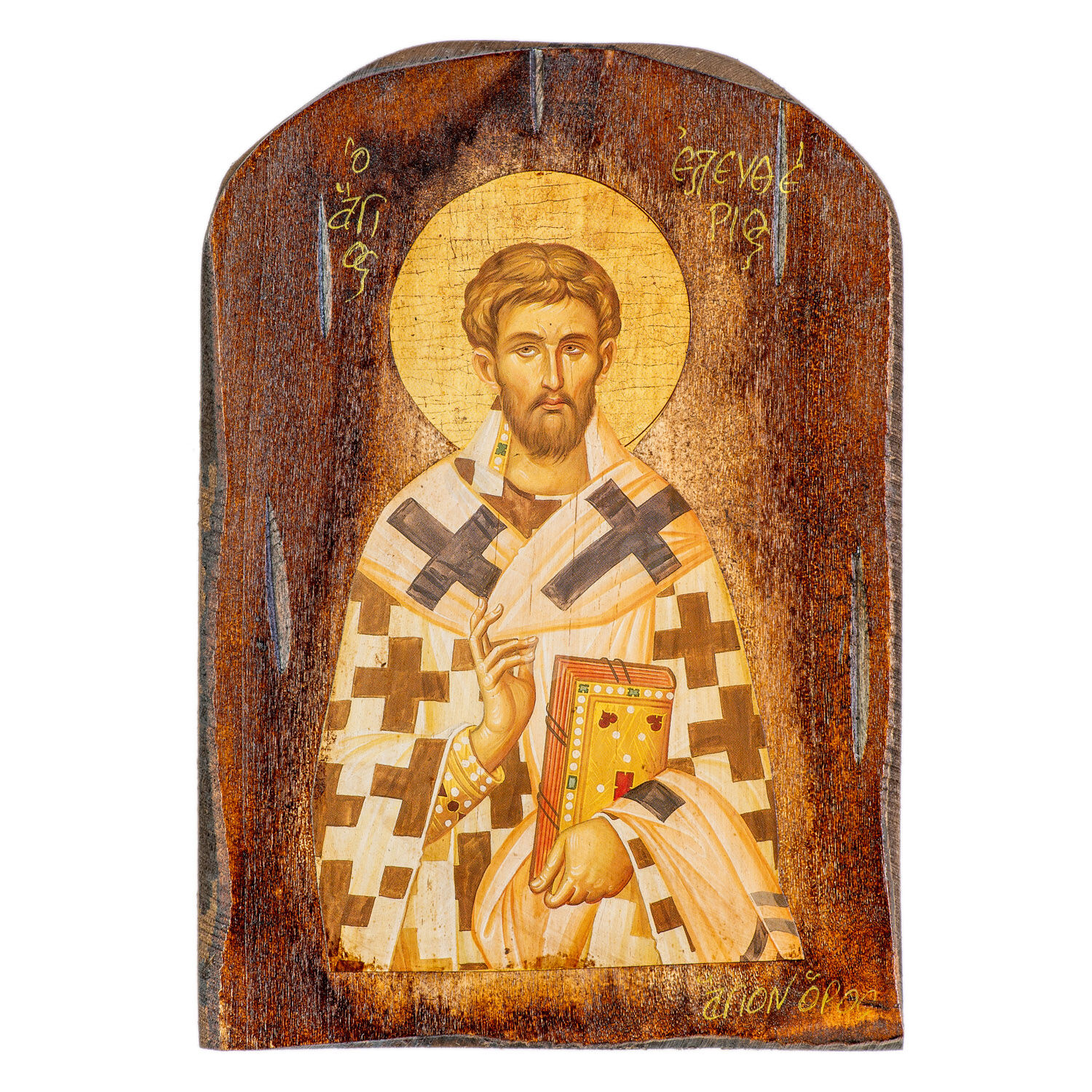 Mount Athos weathered lithography (icon) of Saint Eleutherios the Holy Martyr in pine wood with carved decoration.