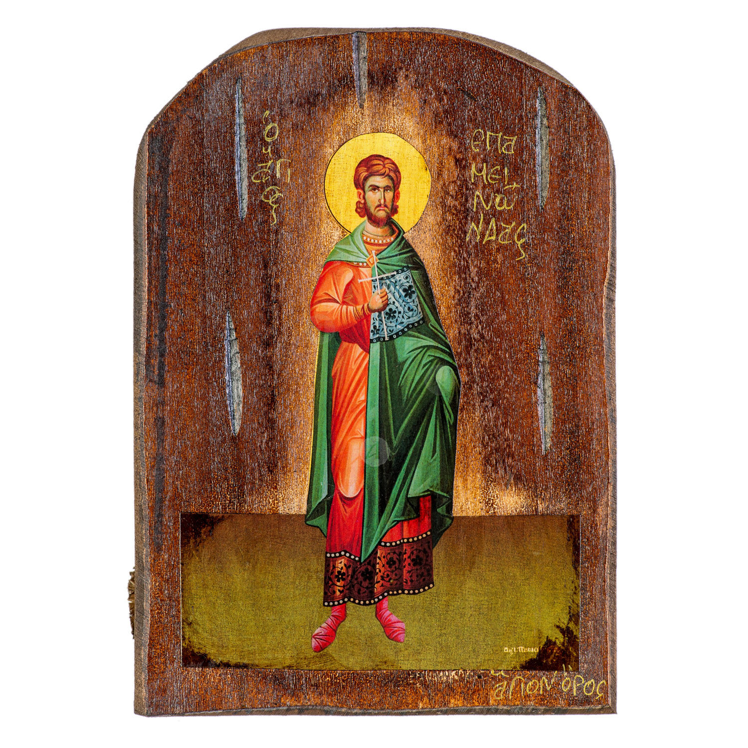 Mount Athos weathered lithography (icon) of Saint Epaminondas the Martyr in pine wood with carved decoration.