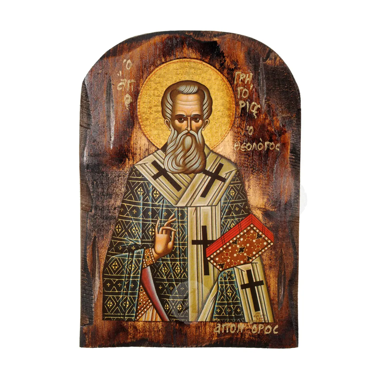 Mount Athos weathered lithography (icon) of Saint Gregory the Theologian in pine wood with carved decoration.