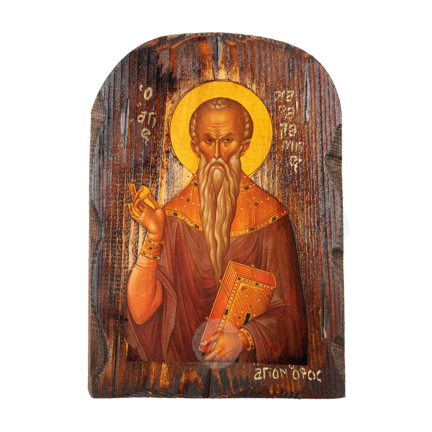 Mount Athos weathered lithography (icon) of Saint Haralambos the Hieromartyr in pine wood with carved decoration.