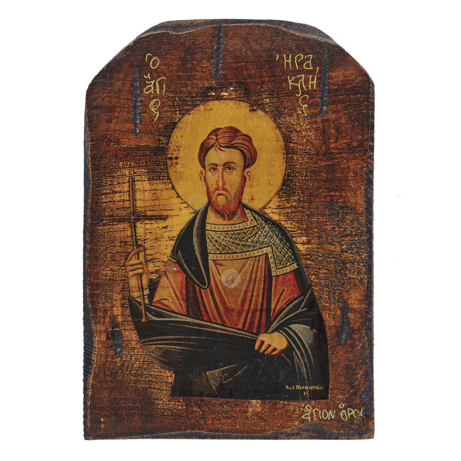 Mount Athos weathered lithography (icon) of Saint Hercules the Martyr in pine wood with carved decoration.