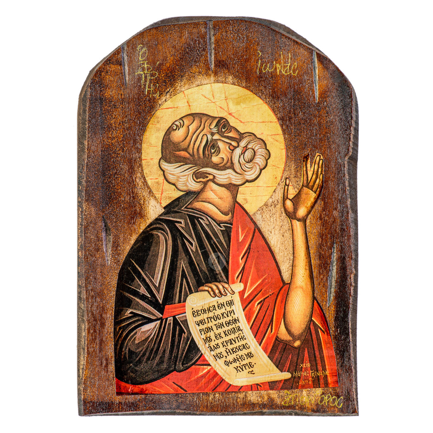 Mount Athos weathered lithography (icon) of Saint Jonah the Prophet in pine wood with carved decoration.