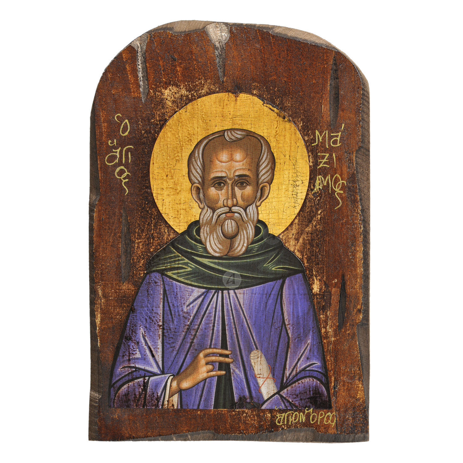 Mount Athos weathered lithography (icon) of Saint Maximus the Confessor in pine wood with carved decoration.