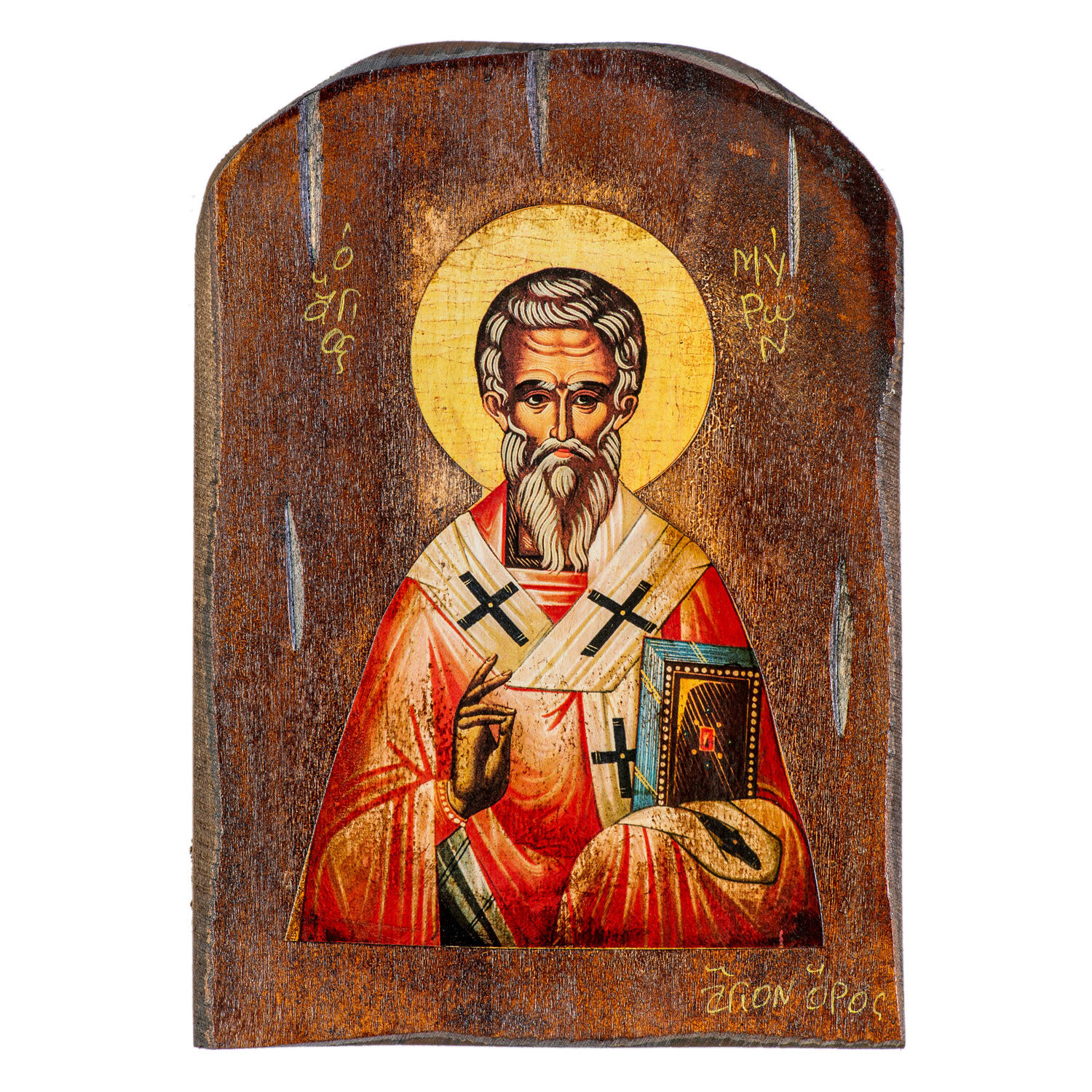 Mount Athos weathered lithography (icon) of Saint Myron, the Wonderworker of Crete, in pine wood with carved decoration.