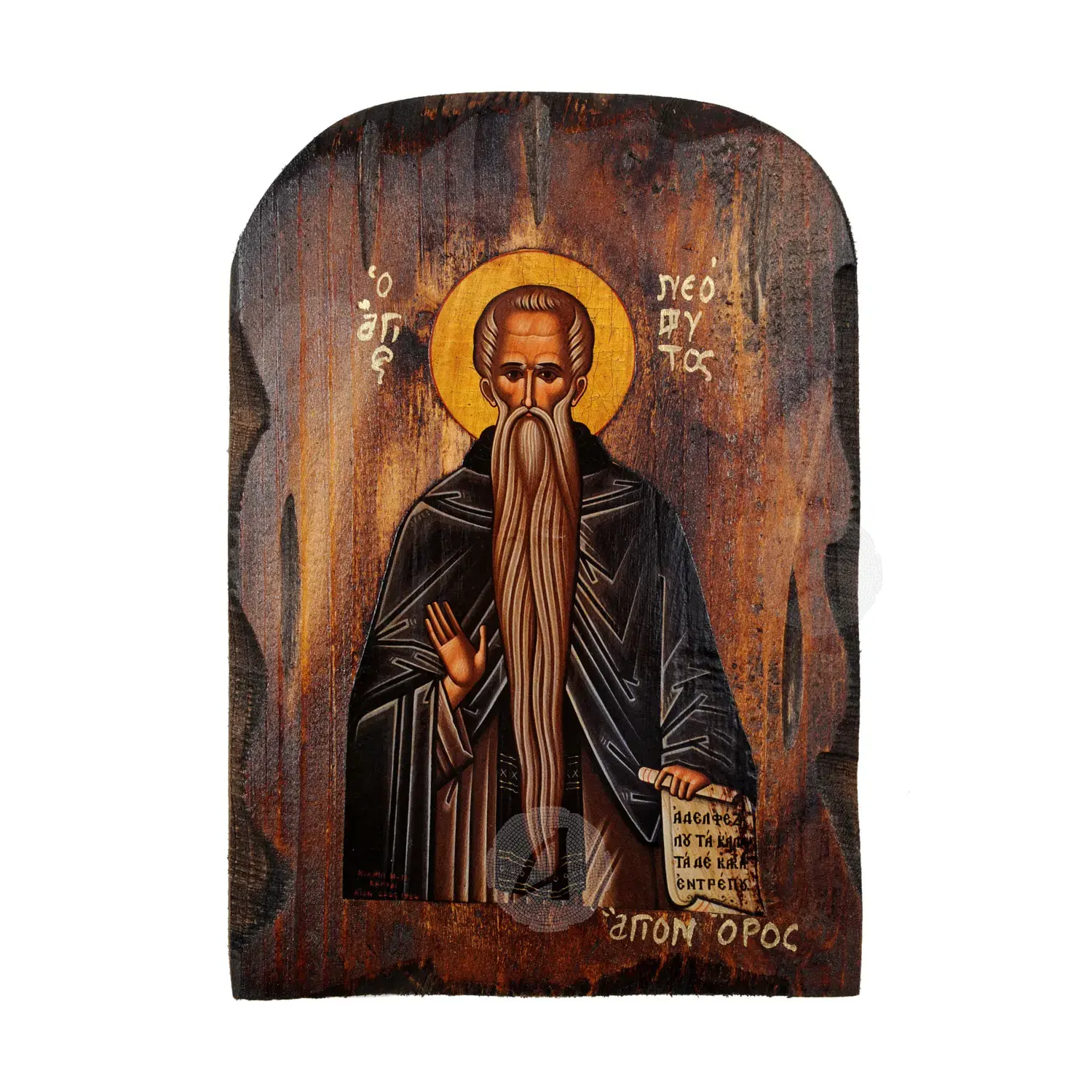 Mount Athos weathered lithography (icon) of Saint Neophytos the Recluse in pine wood with carved decoration.