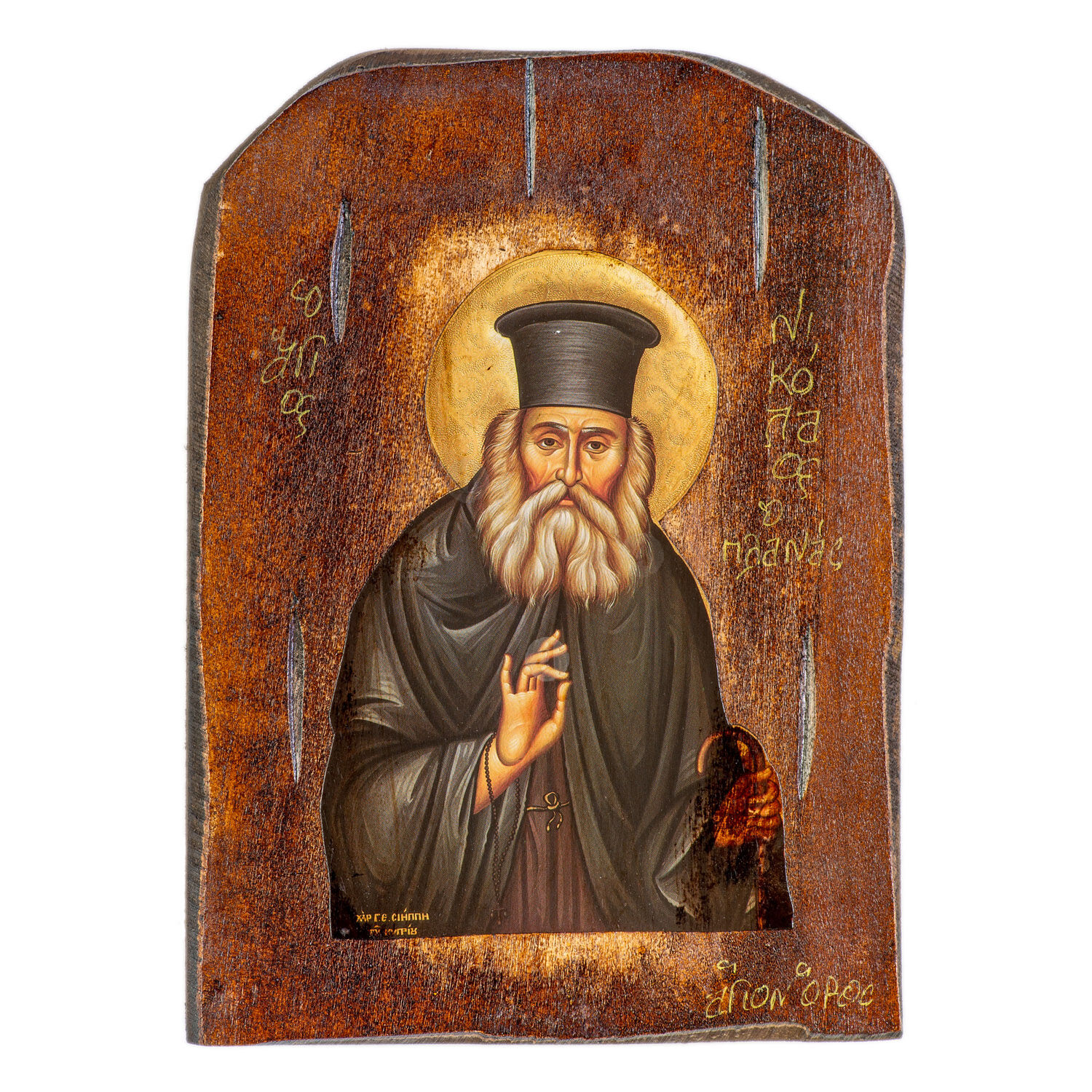 Mount Athos weathered lithography (icon) of Saint Nicholas Planas in pine wood with carved decoration.