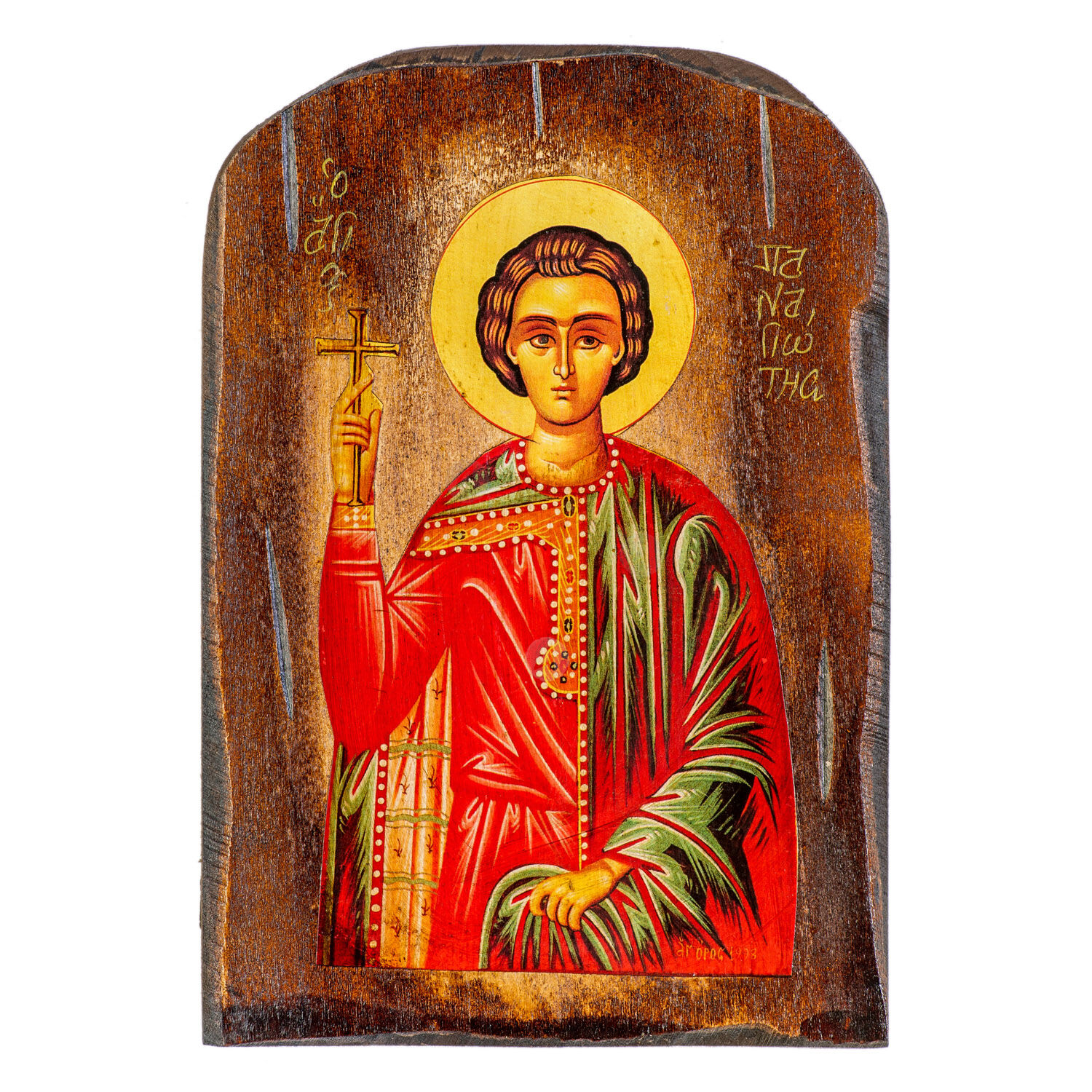 Mount Athos weathered lithography (icon) of Saint Panagiotis the New Martyr in pine wood with carved decoration.