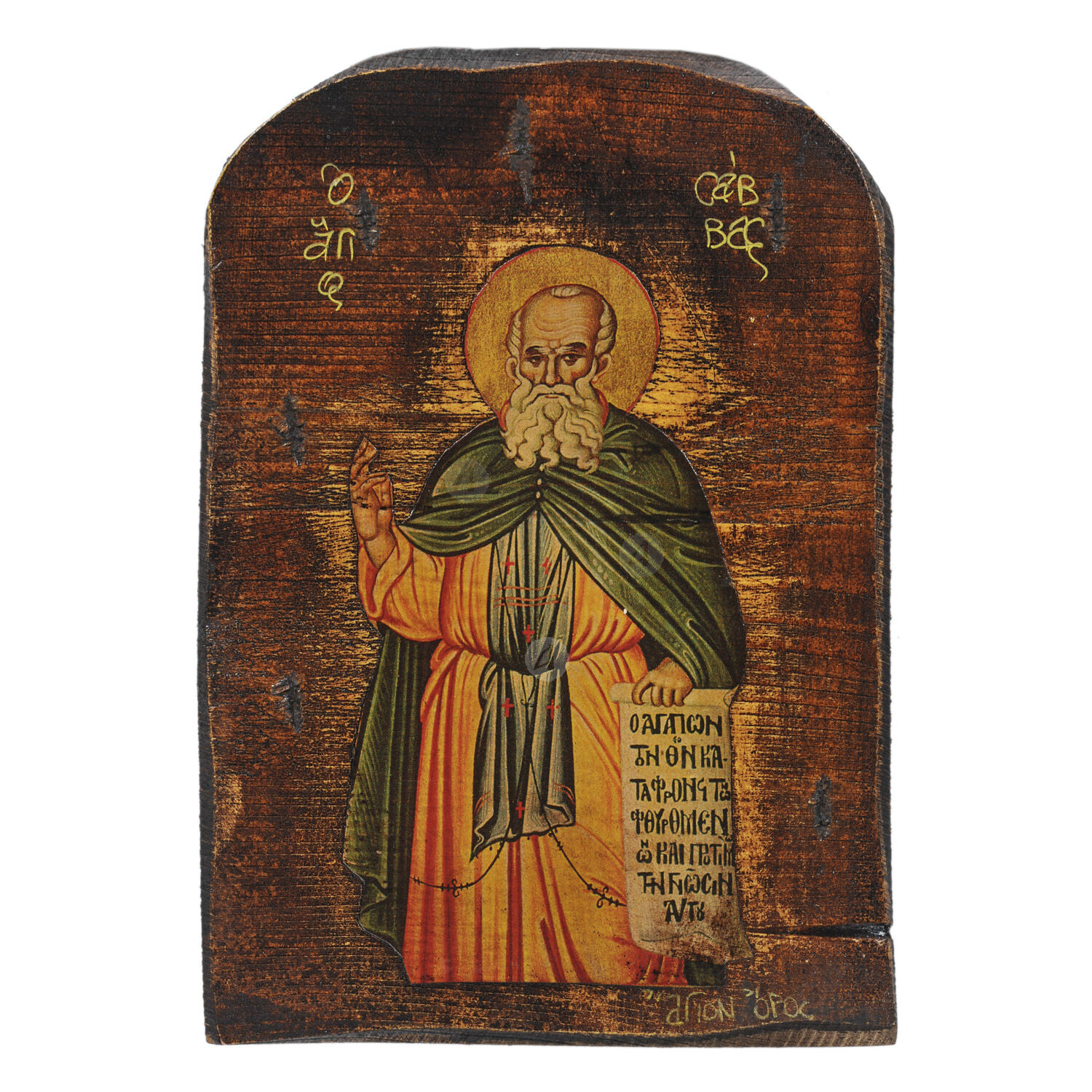 Mount Athos weathered lithography (icon) of Saint Sabbas the Sanctified in pine wood with carved decoration.