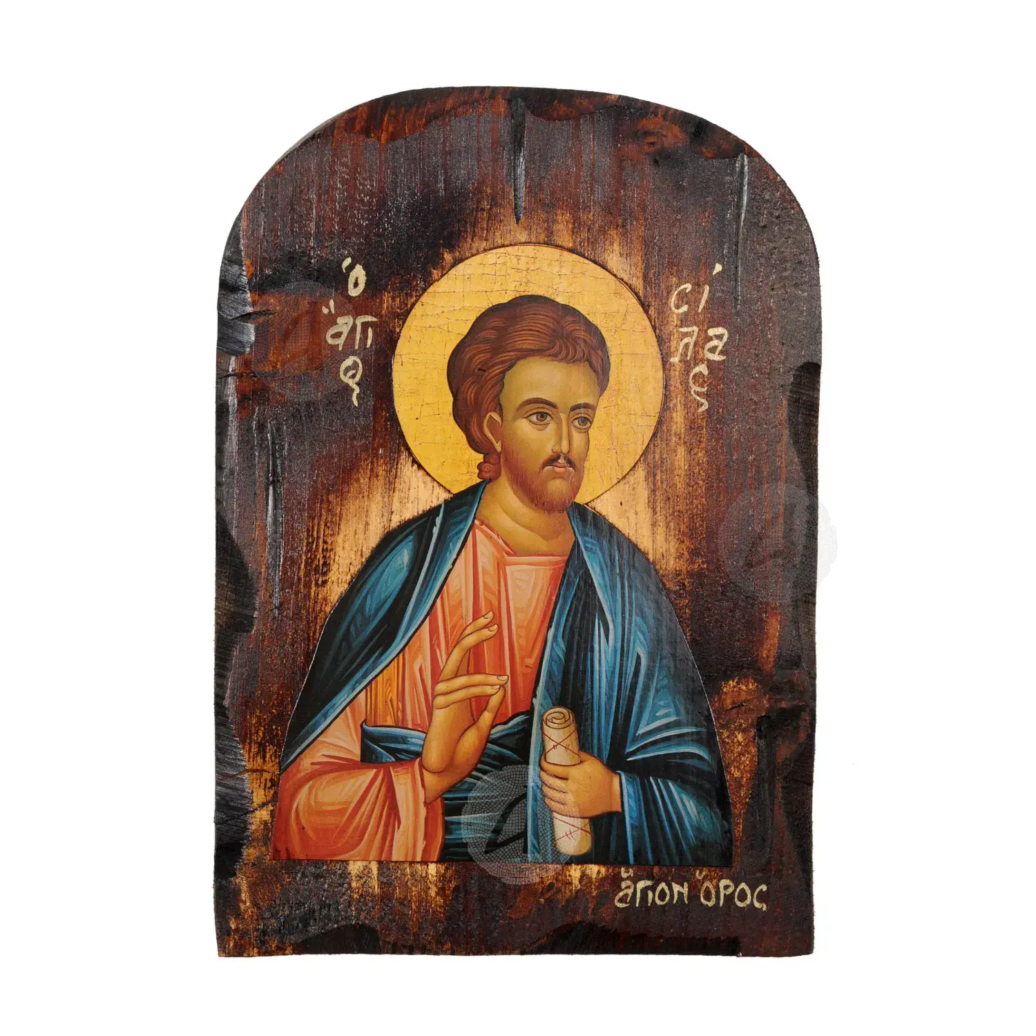 Mount Athos weathered lithography (icon) of Saint Silas the Apostle in pine wood with carved decoration.