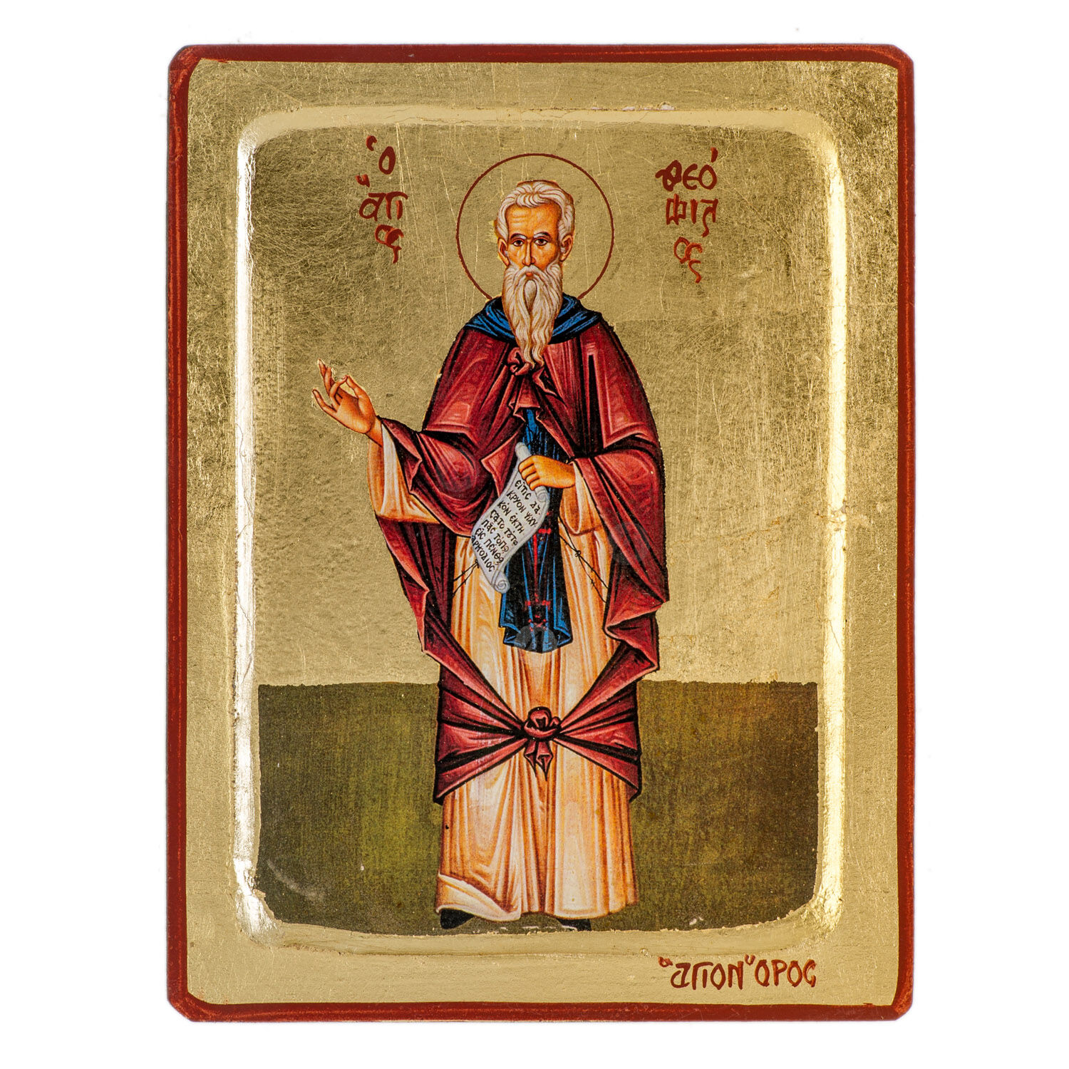 Lithography (icon) of Saint Theophilus, the Myrrhgusher of Pantokrator Monastery, with real gold leaf in MDF.