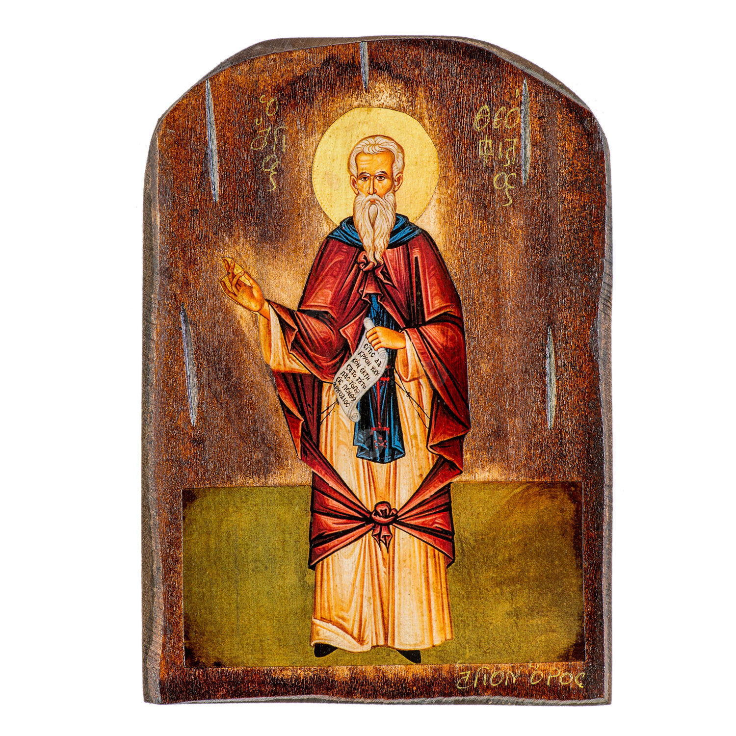 Mount Athos weathered lithography (icon) of Saint Theophilus of Mount Athos in pine wood with carved decoration.