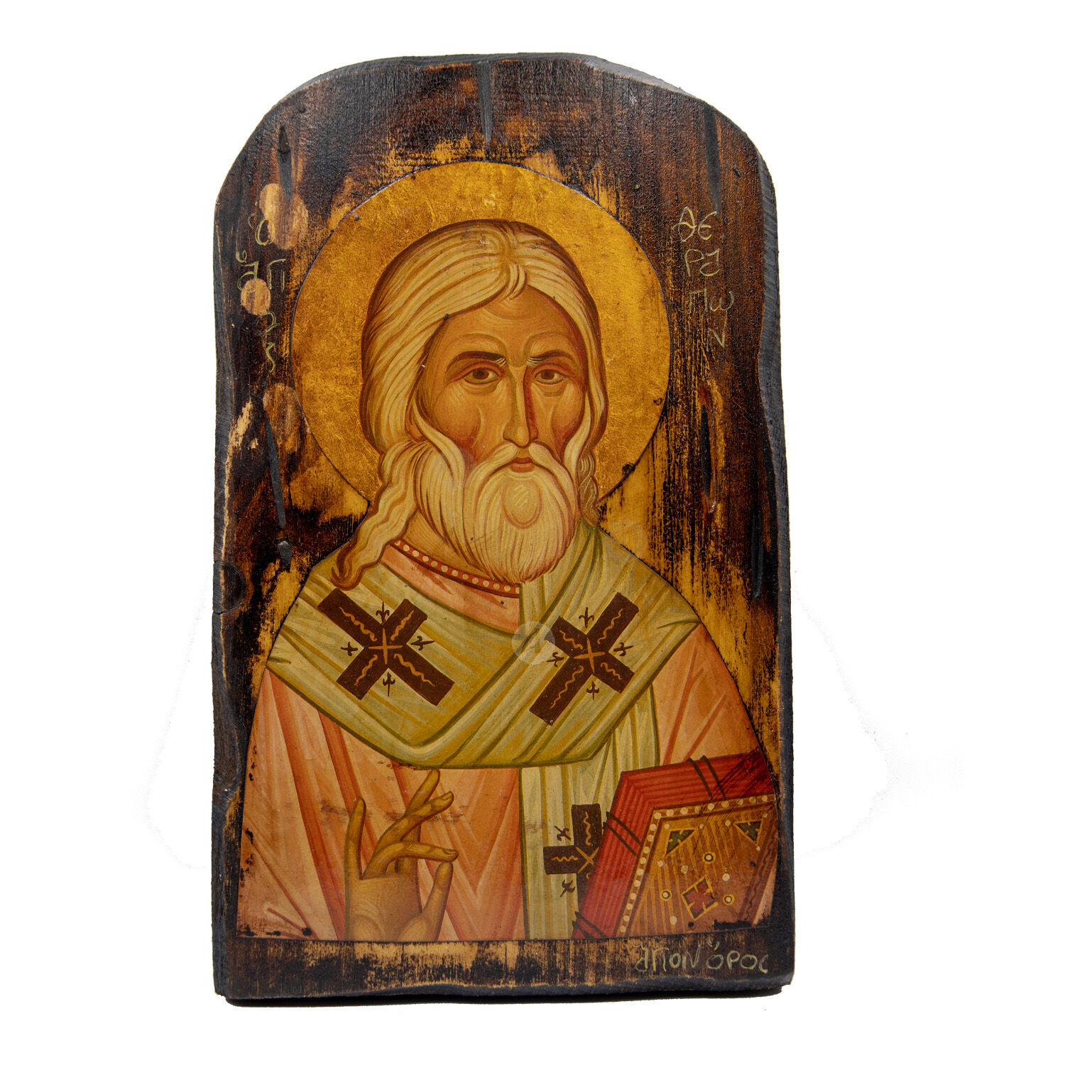 Mount Athos weathered lithography (icon) of Saint Therapon, Bishop of Cyprus, in pine wood with carved decoration.