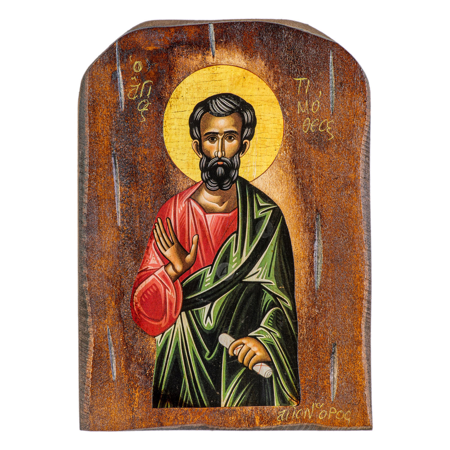 Mount Athos weathered lithography (icon) of Saint Timothy the Apostle in pine wood with carved decoration.