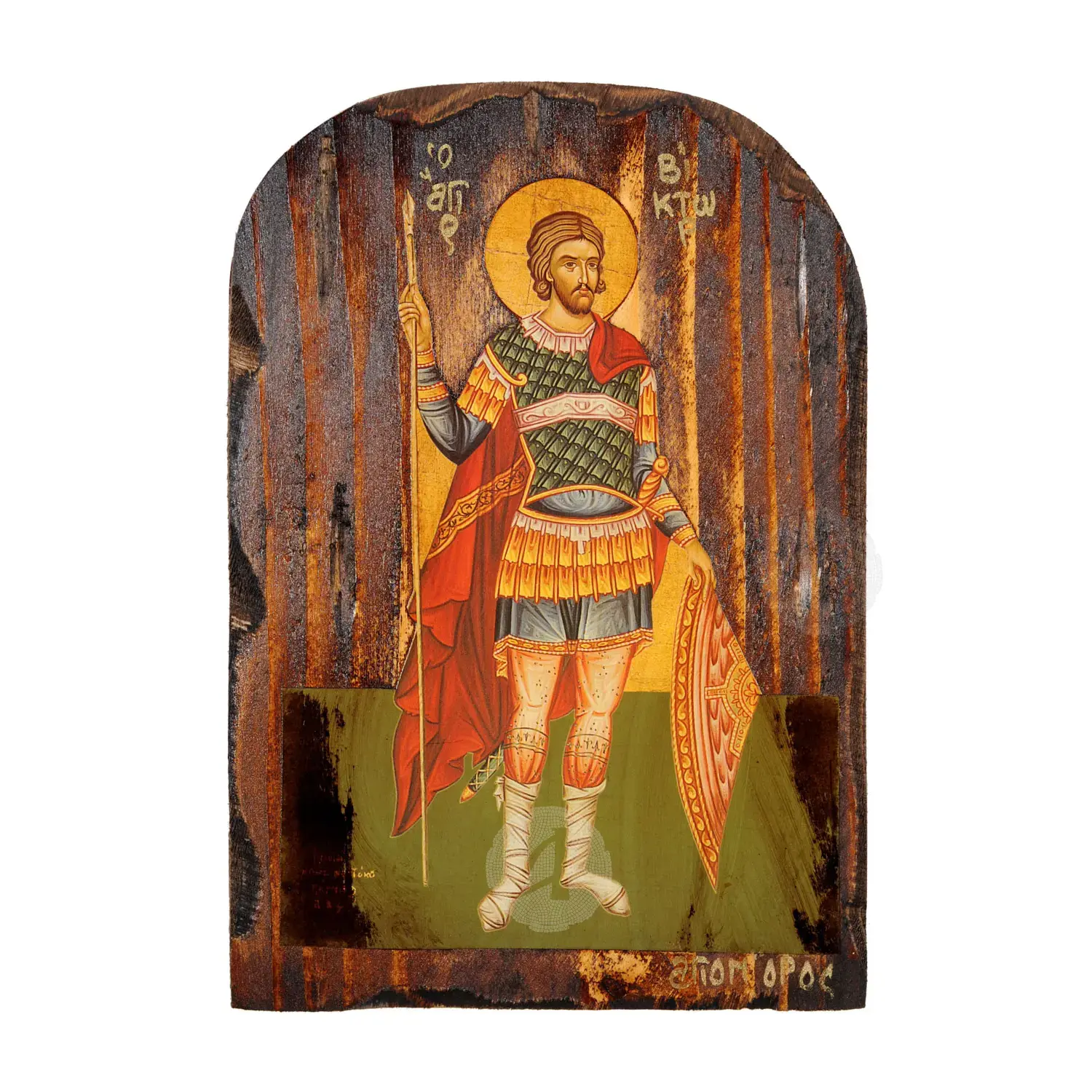 Mount Athos weathered lithography (icon) of Saint Victor the Great Martyr in pine wood with carved decoration.