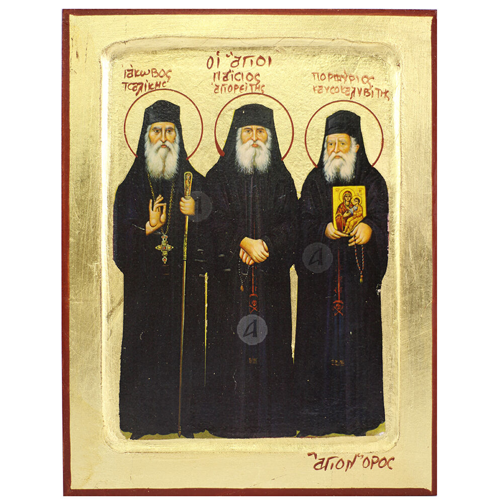 Lithography (icon) of Saints Paisios the Athonite, Porfyrios of Kavsokalyvia & Jacob Tsalikis with real gold leaf in MDF.