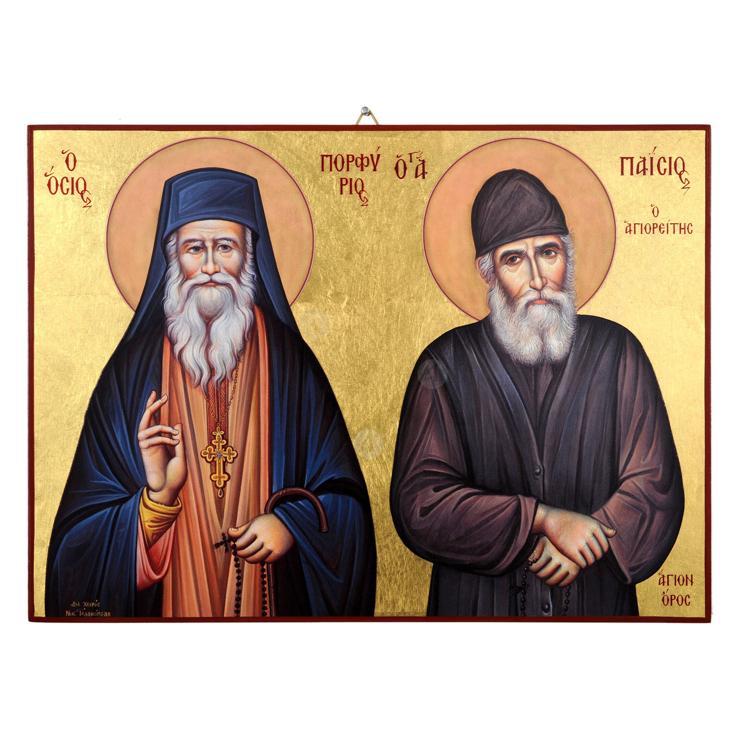 Mount Athos serigraph (icon) of Saints Porphyrios & Paisios on wood with real gold leaves.
