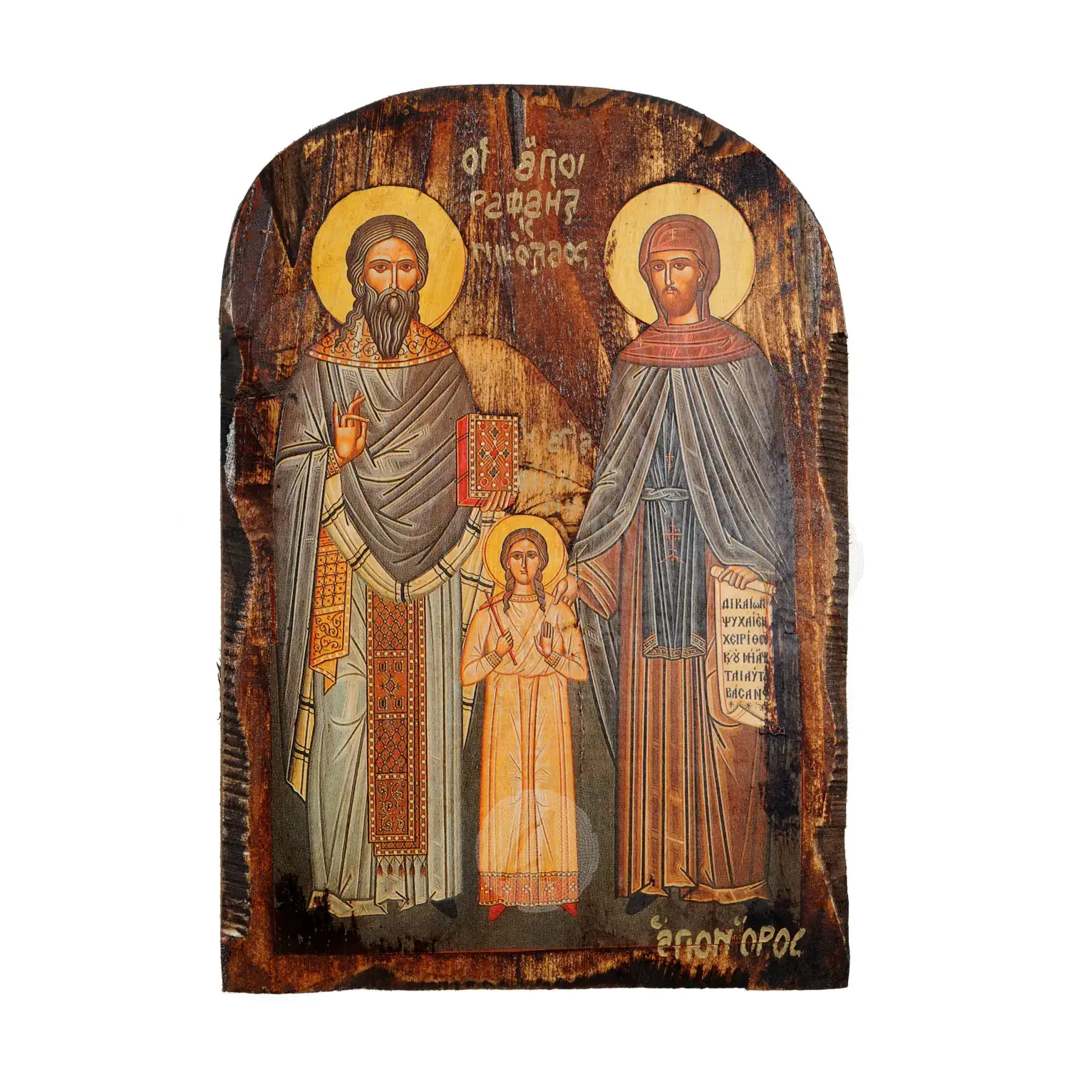 Mount Athos weathered lithography (icon) of Saints Raphael, Nicholas and Irene in pine wood with carved decoration.