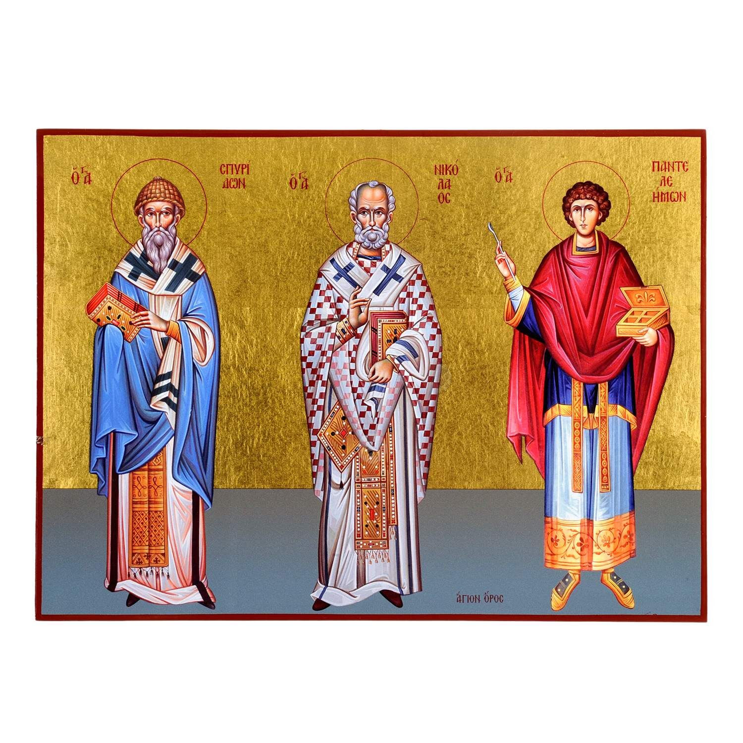 Mount Athos serigraph (icon) of Saints Spyridon, Nicholas & Panteleimon on wood with real gold leaves.
