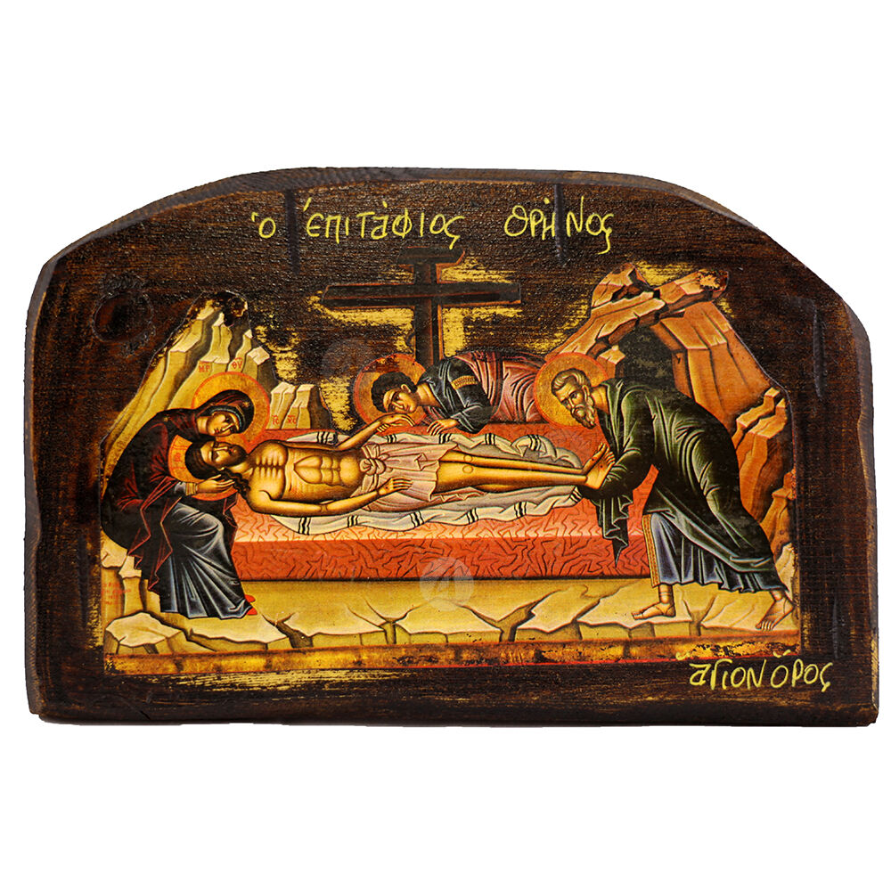 Mount Athos weathered lithography (icon) of the Lamentation of Christ (Epitaph) in pine wood with carved decoration.