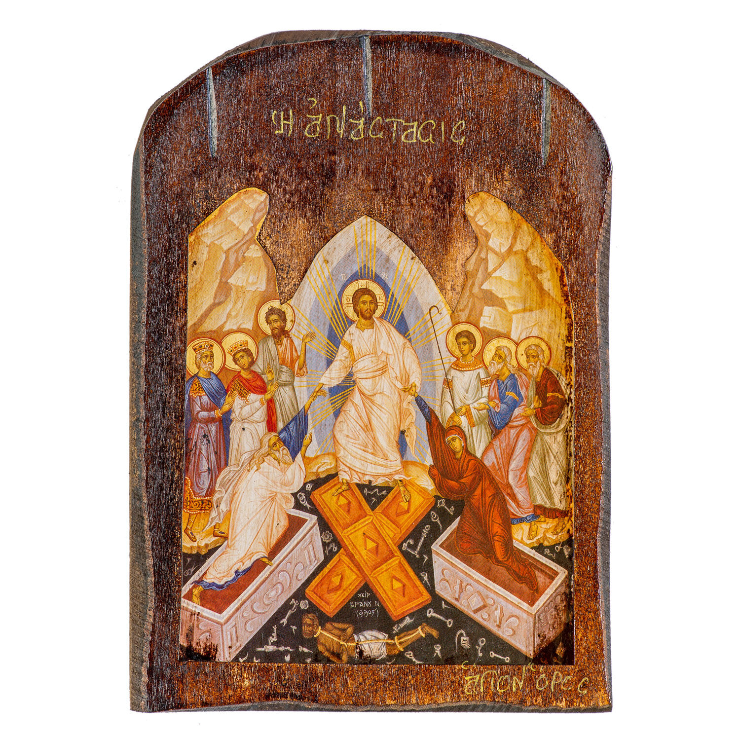 Mount Athos weathered lithography (icon) of The Resurrection of Jesus Christ in pine wood with carved decoration.