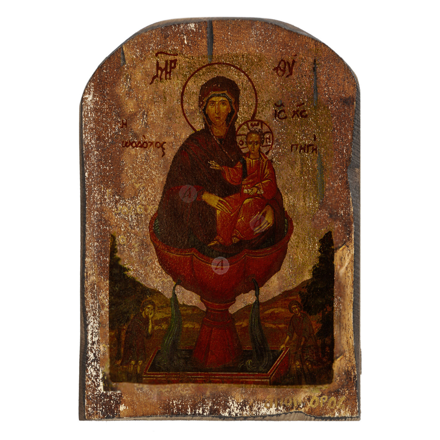 Mount Athos weathered lithography (icon) of Zoodochos Pigi in pine wood with carved decoration.