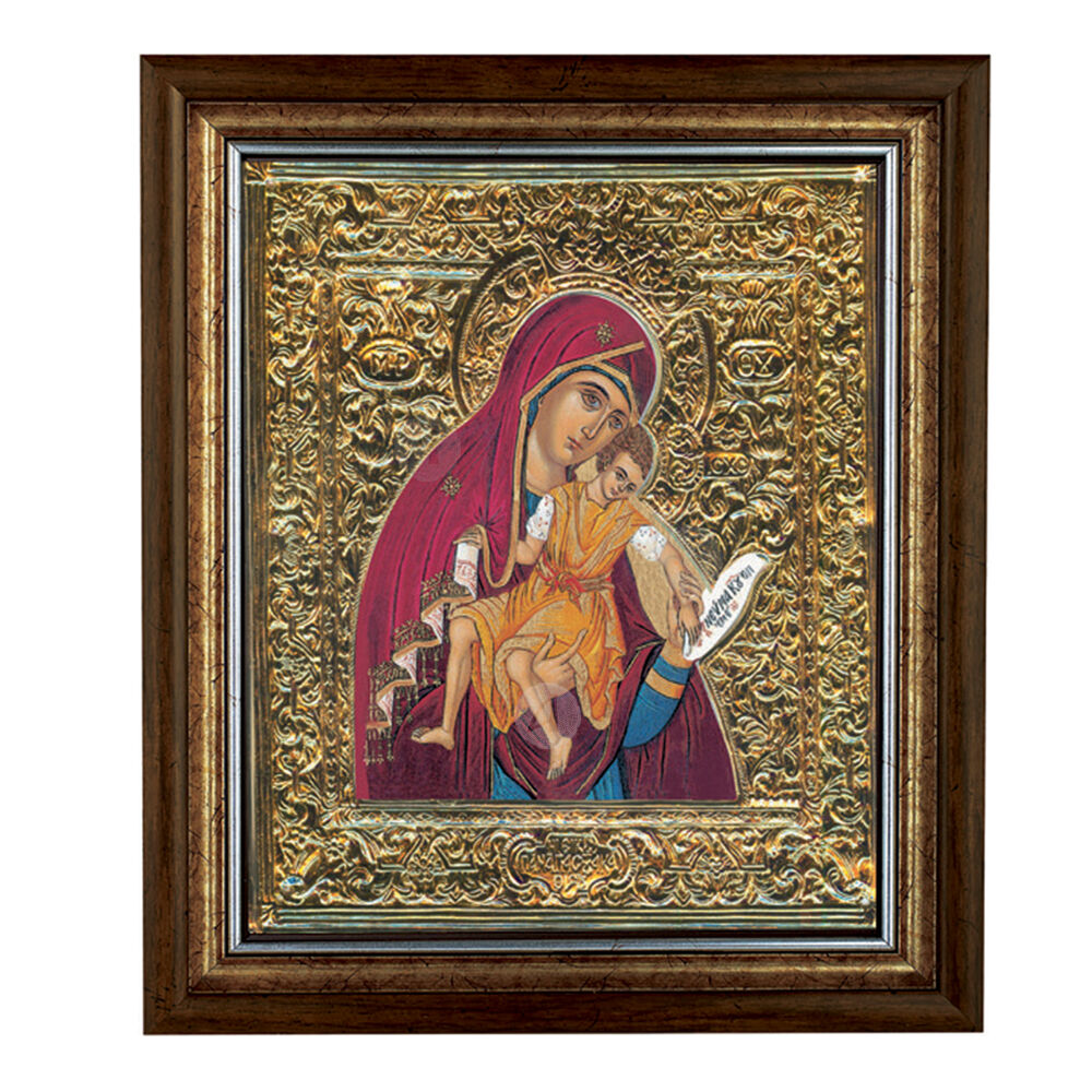 Exact copy of the icon of Virgin Mary of Akathist. The surface treatment with silver 999° (with the pvd method) of the metal cover, together with the special printing process of the sacred image as well as the care dedicated to the smallest details guarantee the invariance and durability over time.