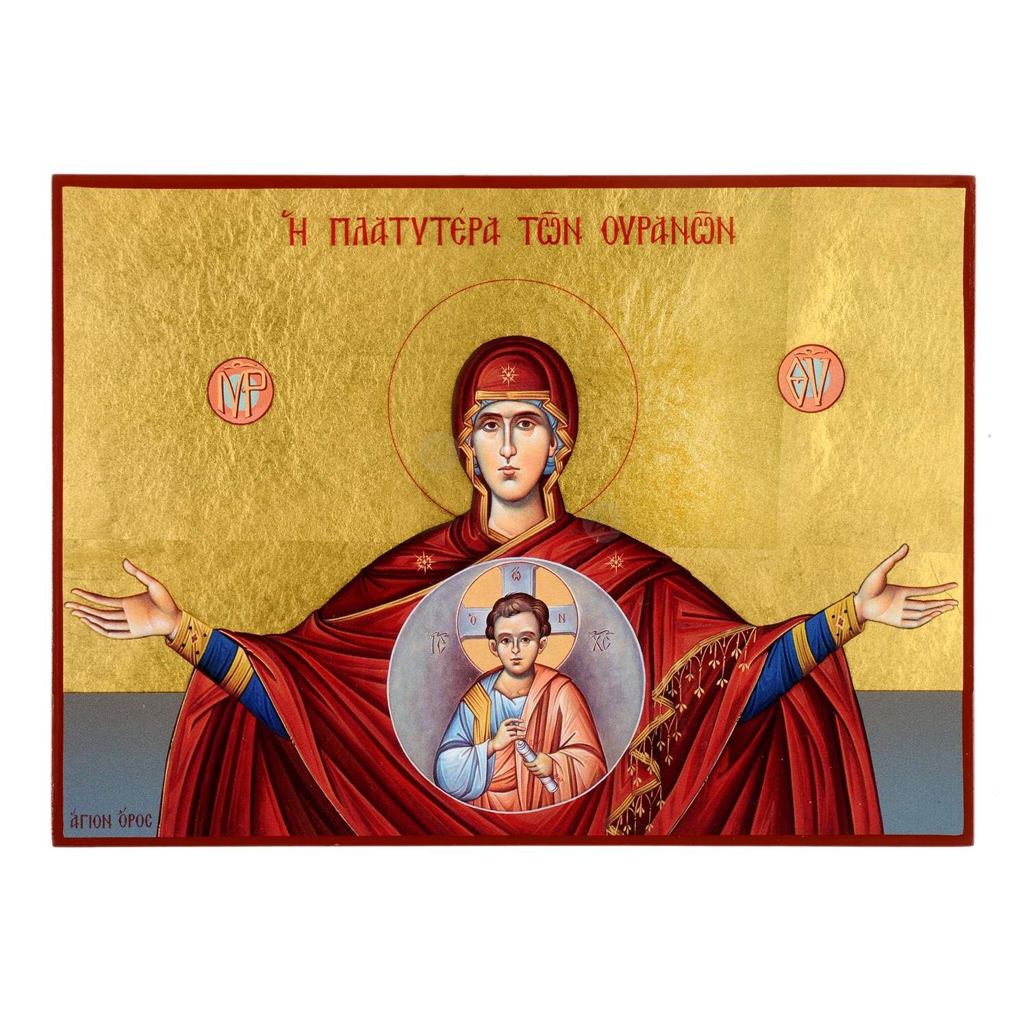 Mount Athos serigraph (icon) of Our Lady of the Sign (Panagia Platytera) on wood with real gold leaves.