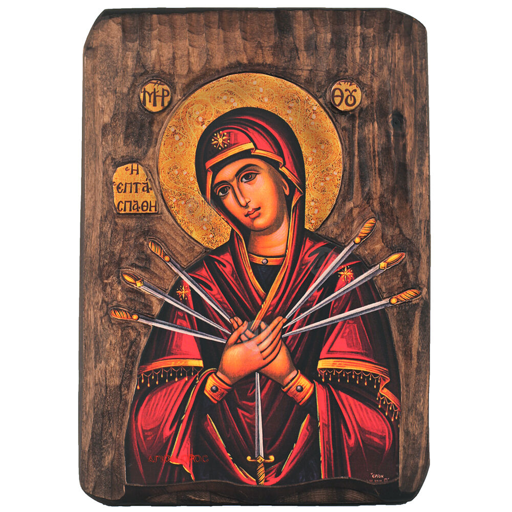Mount Athos icon of Virgin Mary Seven Swords. Lithography on natural wood carved by hand.