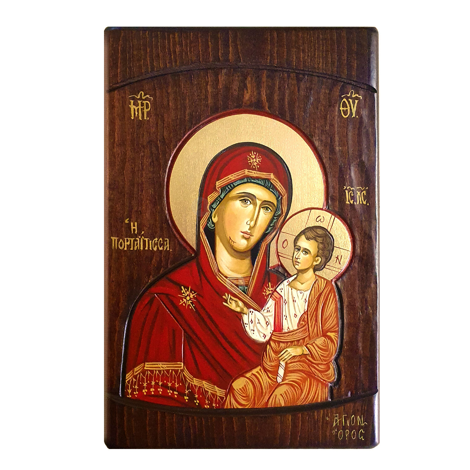 Hand-painted icon on natural wood with gold-plated details. Dimensions: 31x20cm.