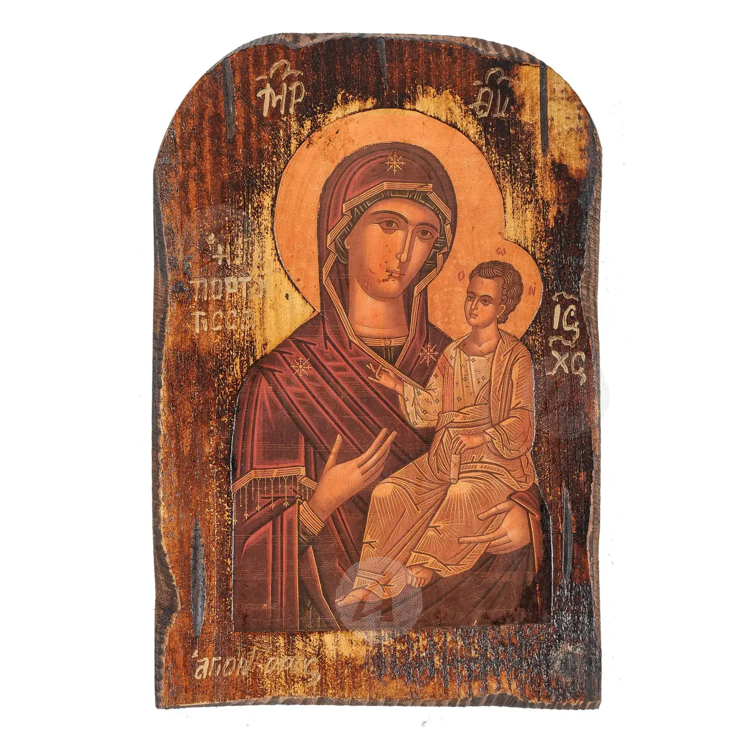 Mount Athos weathered lithography (icon) of Virgin Mary (Panagia) Portaitissa Iviron in pine wood with carved decoration.