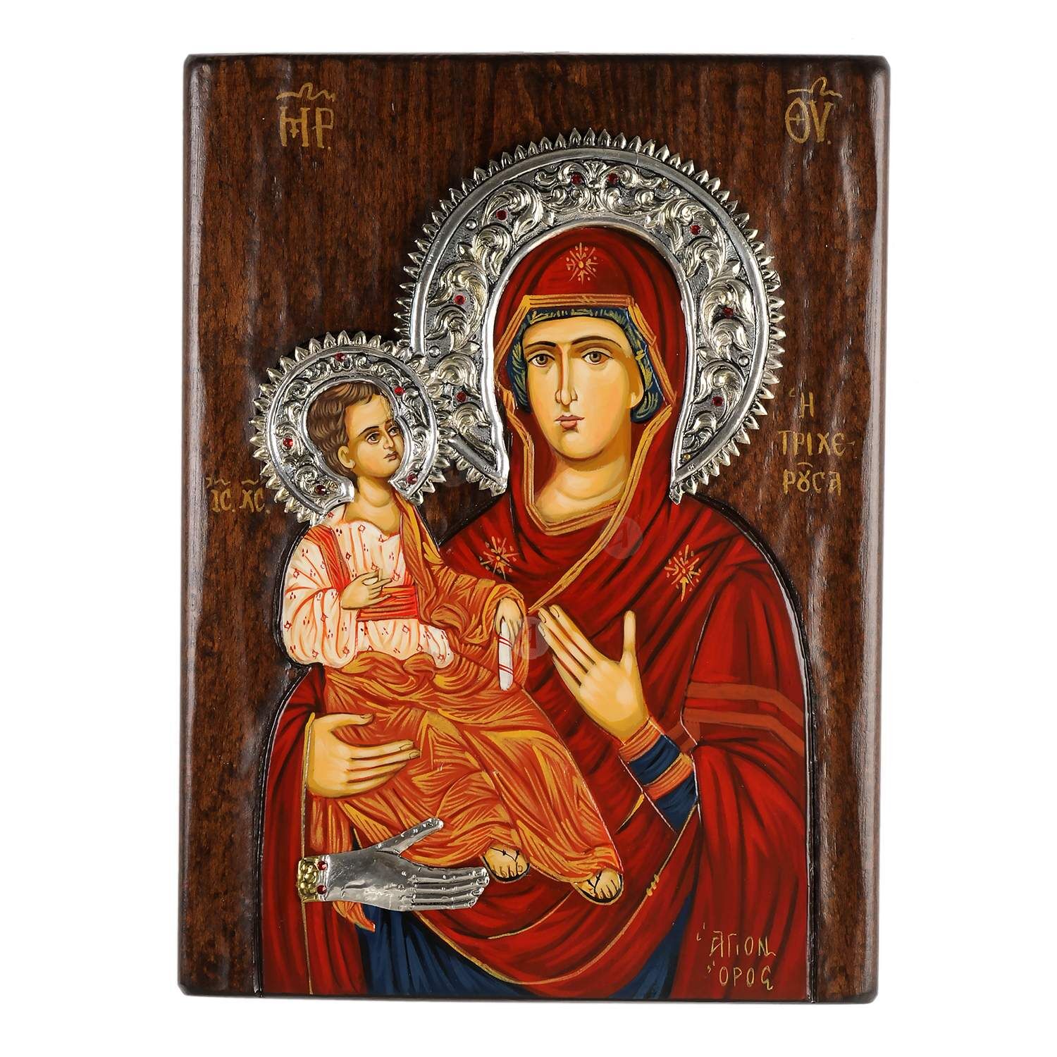 Hand-painted icon on natural wood with halo from 925° silver, gold-plated details and semiprecious stones. Dimensions: 32x23cm.