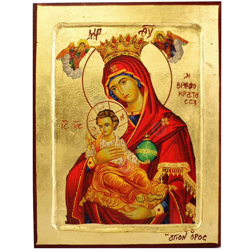 The icon of the Virgin Mary Vrefokratousa depicts the Theotokos holding the little Jesus Christ in her arms. The Virgin Mary is the Mother of the world who gives hope to people and helps them overcome the fear of death. The Virgin Mary is the holiest person of Orthodoxy and our Church. Countless churches and monasteries have been built in her honor and dozens of names have been given to her such as: Paramythia, Galaktotrofousa, Glykophilousa, Gorgoypikoos and many more.