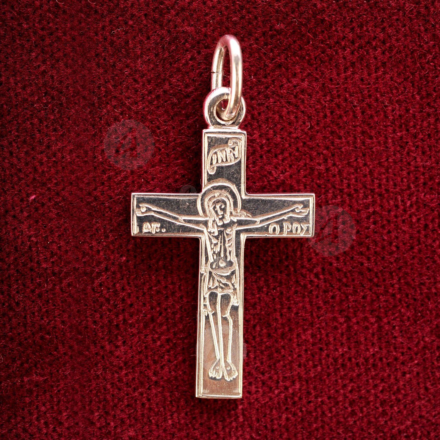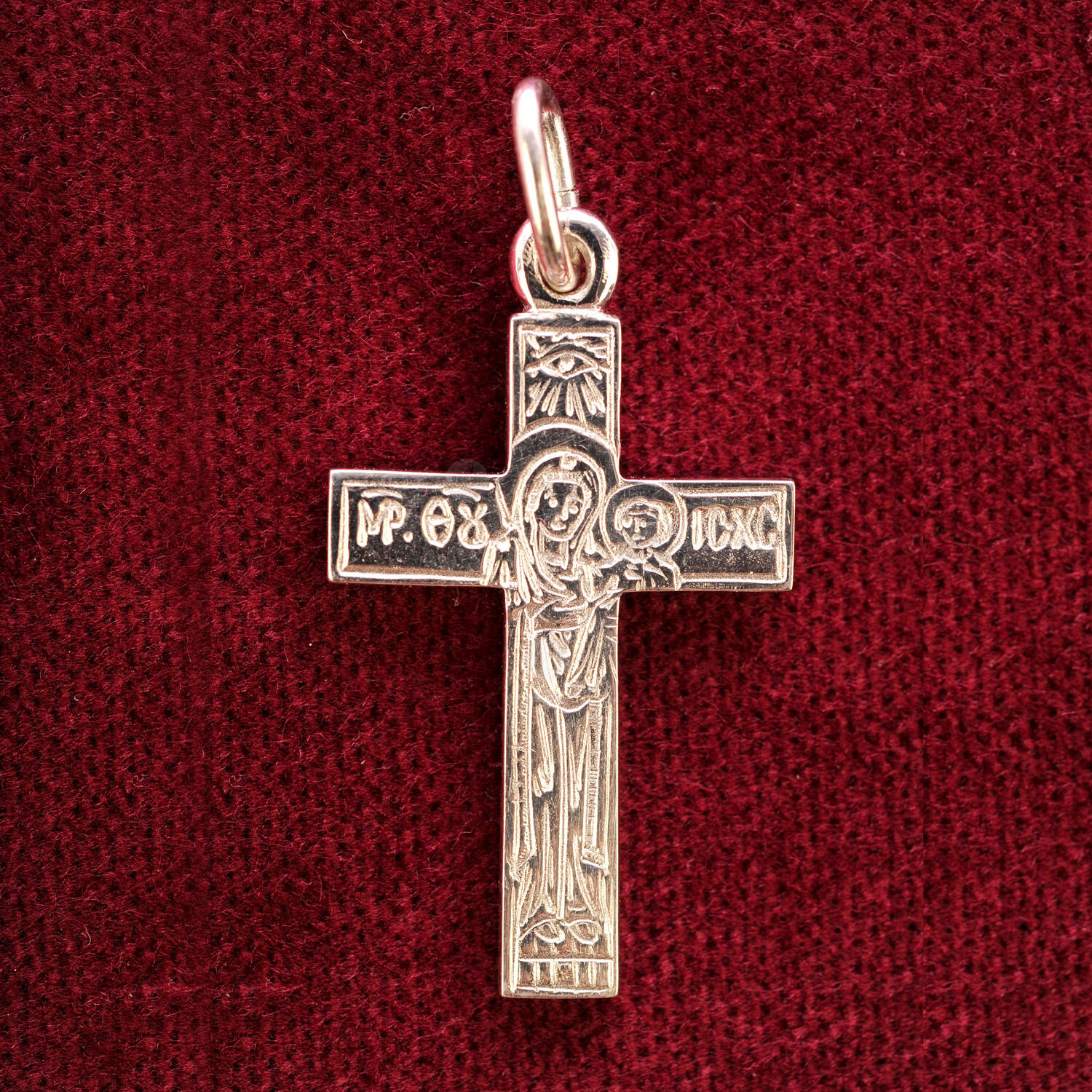 The cross depicts at the front side the Crucifixion of Jesus Christ and the back side the Abbess of Mount Athos and mother of all Christians, Virgin Mary.