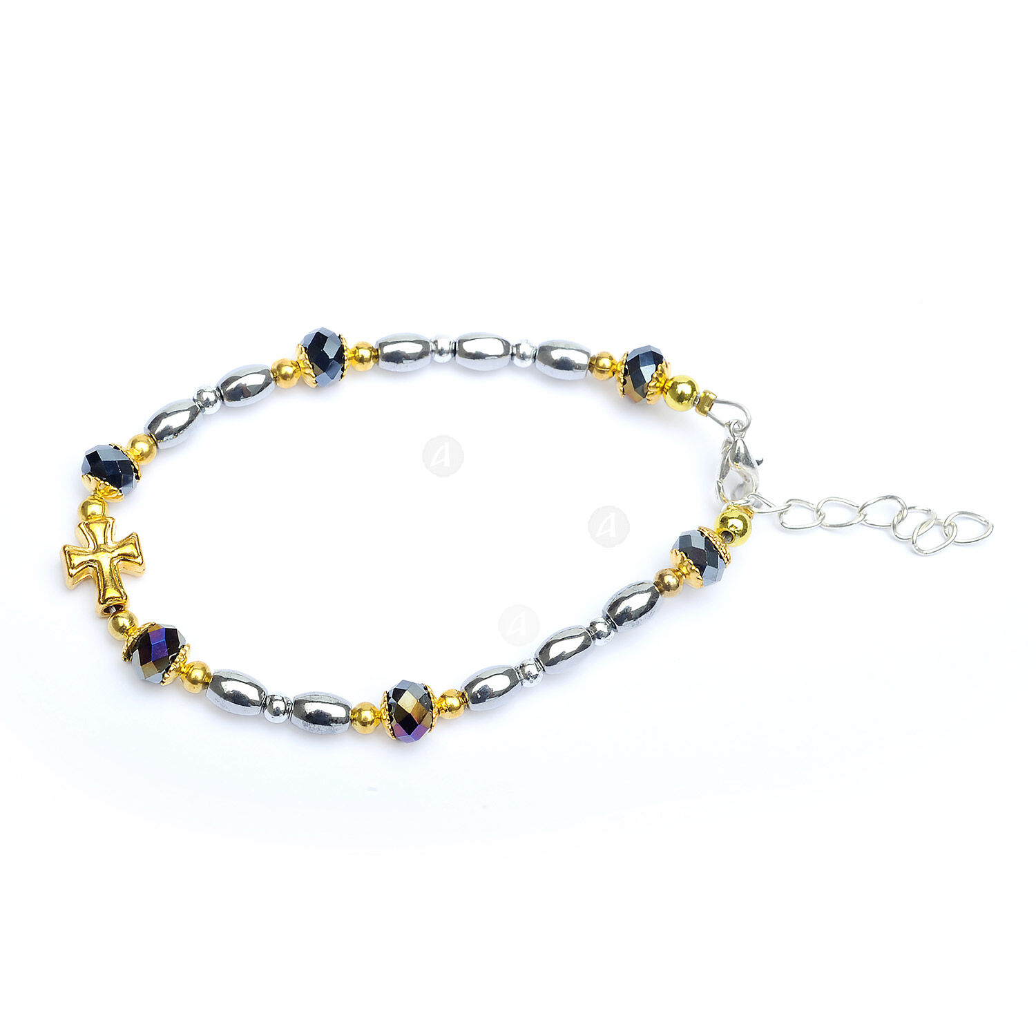 Orthodox bracelet with clasp, gold plated cross and grey semi-precious stones.