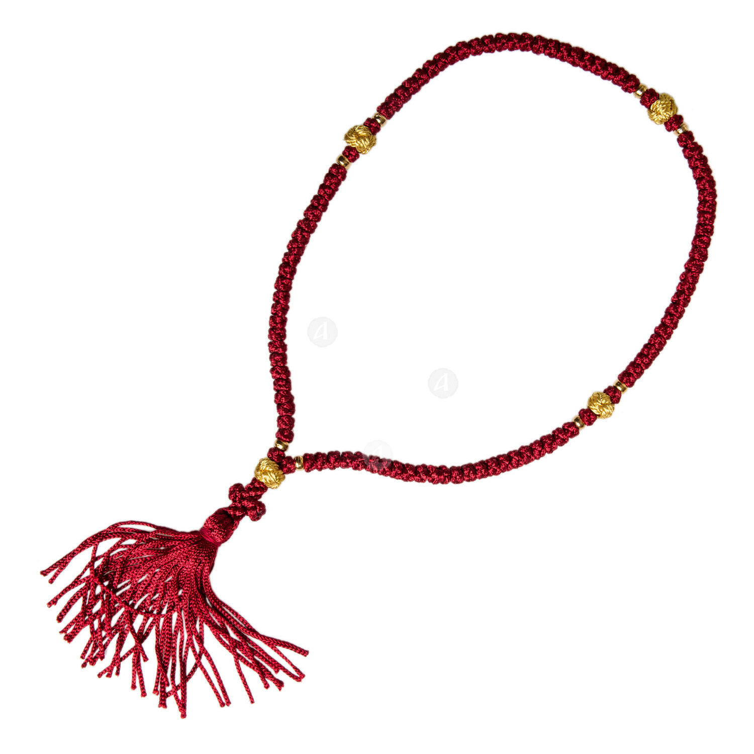 100 knots red prayer rope (komboskini) from silk thread with karydokompos in various colors and a tassel at the end of the cross.