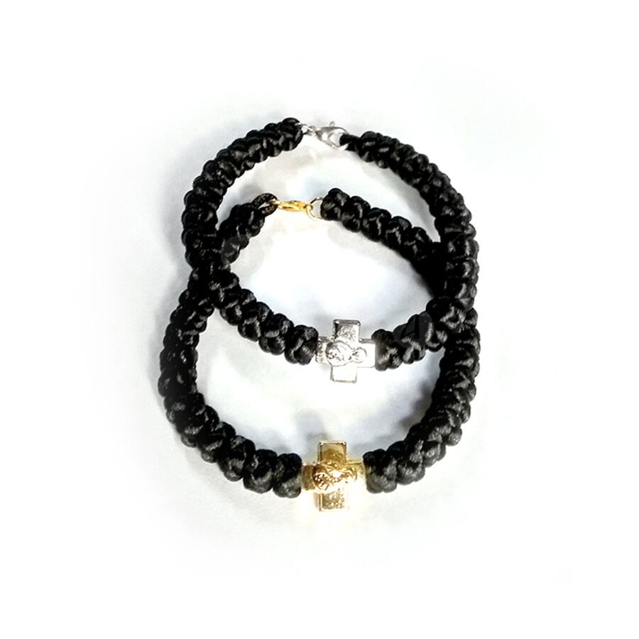 Orthodox prayer rope (chotki) 33 knots in black color made of satin with clasp and silver or gold cross.