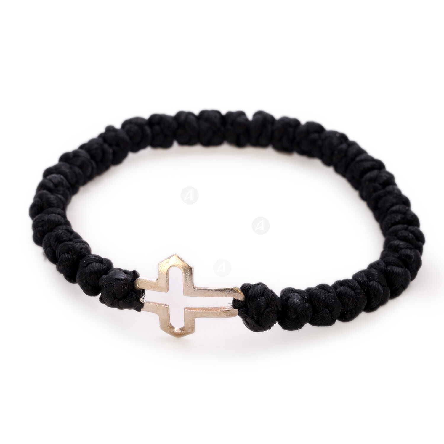 Silk prayer rope (chotki) in black color with slim knots and handmade cross made of 925° silver.