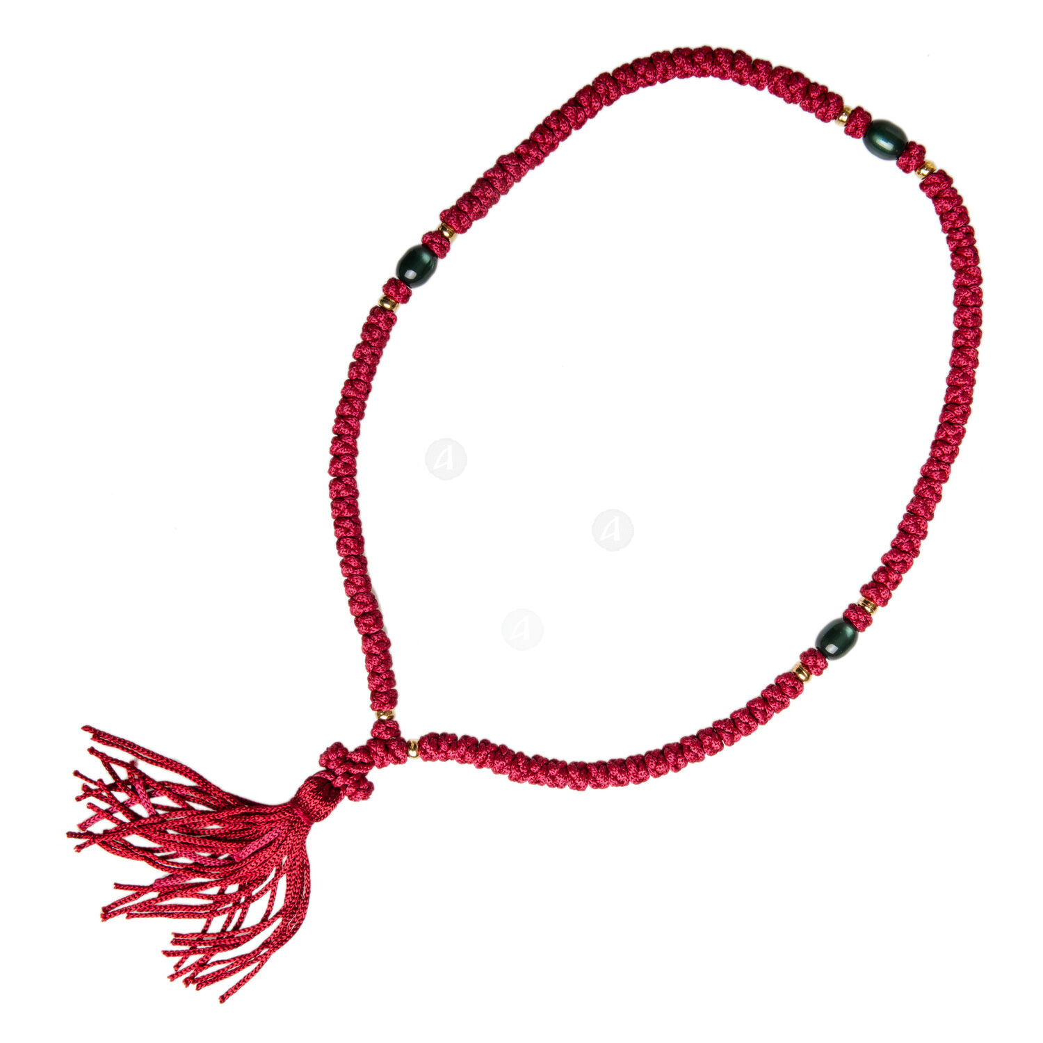 Red prayer rope (komboskini) from silky thread with 100 knots, beads in various colors and a tassel at the end of the cross.