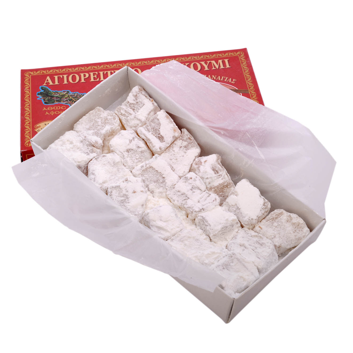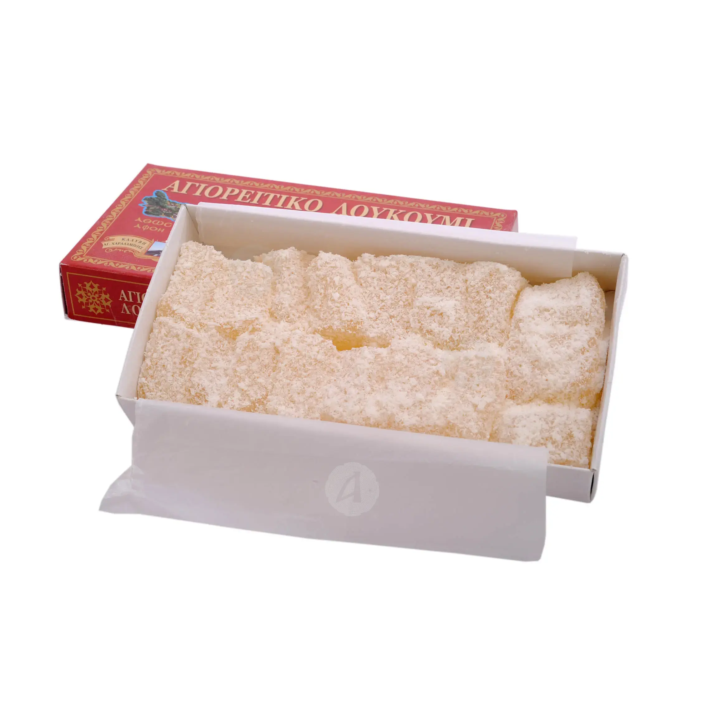 Παραδοσιακό Αγιορείτικο κέρασμα λουκούμι σε τέσσερις διαφορετικές γεύσεις: Τριαντάφυλλο, Καρύδα, Φιστίκι, Περγαμόντο.