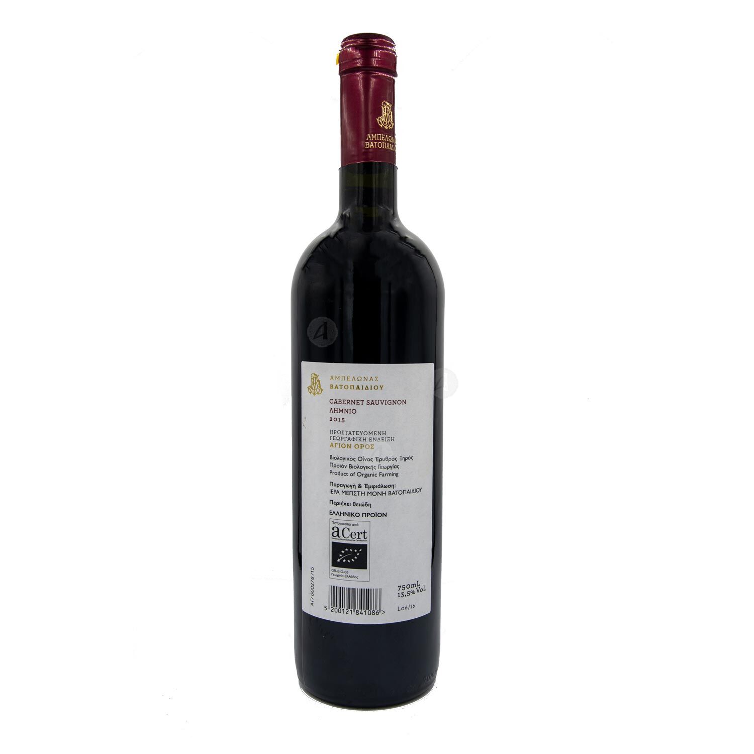 Athonite dry red wine 750ml of Cabernet sauvignon - Limnio variety from Holy Monastery of Vatopedi.